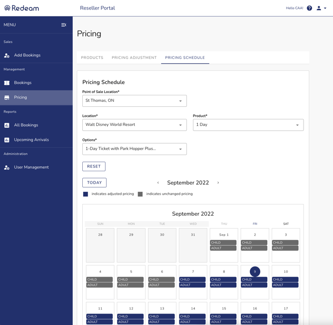 To see what dates have adjustments applied, select the Pricing Schedule tab and add a Location, Product and Option. The Pricing screen displays and highlights any days with price adjustments in blue.